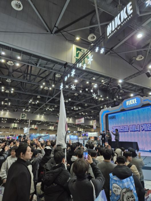 니케를 개발한 유형석 시프트업 디렉터가 이날 무대에 서자 이용자들은 환호했다. 니케 굿즈 현장 줄 대기는 행사가 시작되자마자 끝났다. 김정윤(32)씨는 “니케의 특색있는 스토리 때문에 수년간 이 게임을 하고 있다”며 “굿즈를 구입하기 위해 대구에서 왔다”고 말했다.