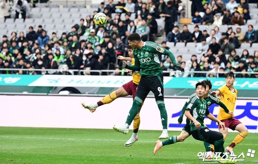 (엑스포츠뉴스 박지영 기자) 6일 오후 서울월드컵경기장에서 열린 '2025 하나은행 코리아컵 결승전' 광주FC와 전북 현대의 경기, 광주 헤이스와 전북 티아고가 공중볼 경합을 하고 있다.박지영 기자 jypark@xportsnews.com
