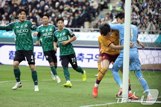 (서울=뉴스1) 박정호 기자 = 6일 오후 서울 마포구 월드컵로 서울월드컵경기장에서 열린 광주FC와 전북현대의 2025 하나은행 코리아컵 결승전에서 광주 변준수가 공중볼을 향해 쇄도하다 전북 김정훈 골키퍼와 충돌하고 있다. 2025.12.6/뉴스1pjh2035@news1.krCopyright ⓒ 뉴스1. All rights reserved. 무단 전재 및 재배포, AI학습 이용 금지.