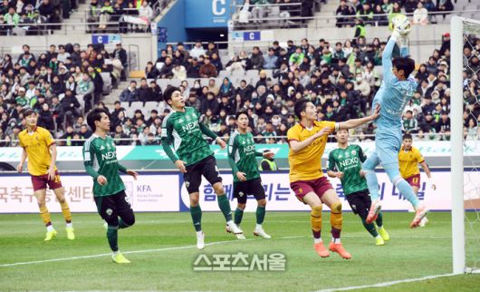 광주FC 변준수(오른쪽 둘째)가 6일 서울월드컵경기장에서 열린 2025 하나은행 코리아컵 전북 현대와의 결승전에서 공을 잡을 전북 골키퍼 김정훈과 부딪히고 있다. 2025. 12. 6.박진업 기자 upandup@sporttsseoul.com [기사제보 news@sportsseoul.com] Copyright ⓒ 스포츠서울&sportsseoul.com