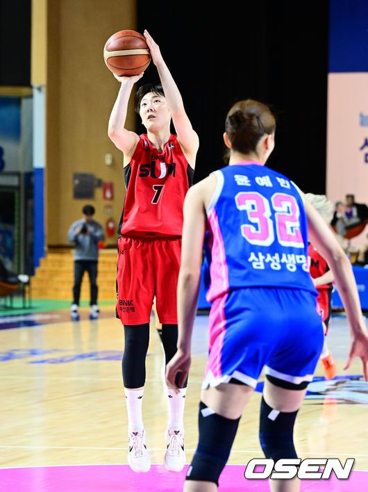 [OSEN=용인, 지형준 기자] 6일 오후 용인실내체육관에서 BNK금융 2025-26 여자프로농구 삼성생명과 BNK 썸의 경기가 열렸다. 중위권 경쟁을 펼치는 두 팀의 대결이다. 삼성생명은 4위(2승3패), BNK 썸은 3위(3승 2패)를 기록중이다. 1쿼터 BNK 썸 박혜진이 슛을 시도하고 있다. 2025.12.06 /jpnews@osen.co.kr