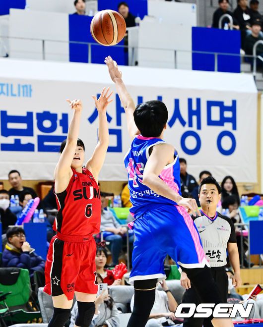 [OSEN=용인, 지형준 기자] 6일 오후 용인실내체육관에서 BNK금융 2025-26 여자프로농구 삼성생명과 BNK 썸의 경기가 열렸다. 중위권 경쟁을 펼치는 두 팀의 대결이다. 삼성생명은 4위(2승3패), BNK 썸은 3위(3승 2패)를 기록중이다. 1쿼터 BNK 썸 이소희가 삼성생명 가와무라 미유키의 수비를 피해 슛을 시도하고 있다. 2025.12.06 /jpnews@osen.co.kr