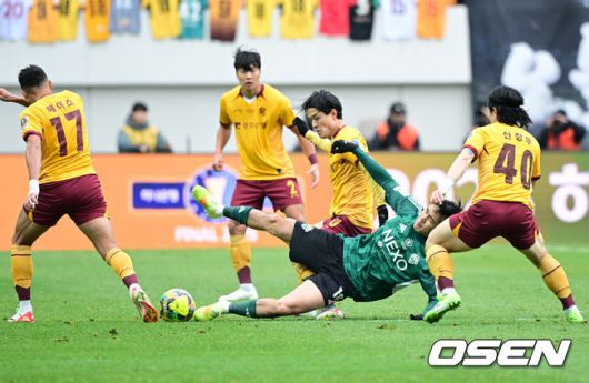 [OSEN=상암월드컵경기장, 조은정 기자] 2025 하나은행 코리아컵 전북FC와 광주FC의 결승전이 6일 서울 마포구 서울월드컵경기장에서 열렸다. 시민구단 광주는 사상 첫 코리안컵 우승에 도전, 전북은 올해 K리그1 우승에 이어 두 번째 더블을 노린다. 전반 전북 송민규가 볼경합 중 넘어지고 있다. 2025.12.06 /cej@osen.co.kr