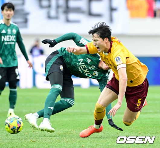 [OSEN=상암월드컵경기장, 조은정 기자] 2025 하나은행 코리아컵 전북FC와 광주FC의 결승전이 6일 서울 마포구 서울월드컵경기장에서 열렸다. 시민구단 광주는 사상 첫 코리안컵 우승에 도전, 전북은 올해 K리그1 우승에 이어 두 번째 더블을 노린다. 전반 전북 티아고가 광주 변준수에게 파울을 범하고 있다. 2025.12.06 /cej@osen.co.kr