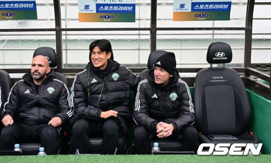 전북 포옛 감독 자리가 비어있는 가운데 지휘봉을 잡은 정조국 코치(왼쪽에서 두 번째)가 코치진과 대화를 나누고 있다. 2025.12.06 /cej@osen.co.kr