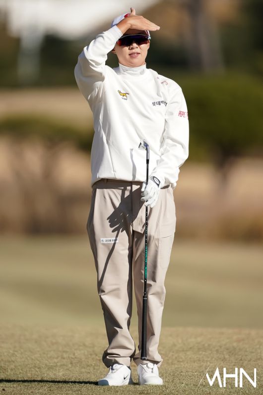 [mhn포토] 김효주, 햇빛 가리며 바라보는 타구 방향