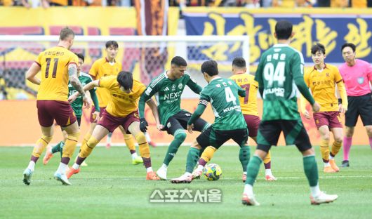 6일 서울월드컵경기장에서 열린 2025 하나은행 코리아컵 광주FC와 전북 현대의 결승전에서 앞서 양팀 선수들이 볼다툼을 벌이고 있다. 2025. 12. 6.박진업 기자 upandup@sporttsseoul.com [기사제보 news@sportsseoul.com] Copyright ⓒ 스포츠서울&sportsseoul.com