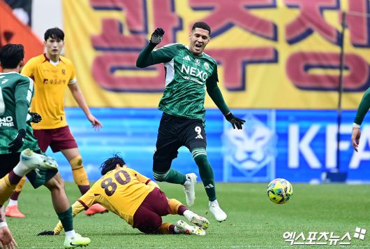 (엑스포츠뉴스 박지영 기자) 6일 오후 서울월드컵경기장에서 열린 '2025 하나은행 코리아컵 결승전' 광주FC와 전북 현대의 경기, 전북 티아고가 광주 주세종의 태클에 넘어지고 있다.박지영 기자 jypark@xportsnews.com