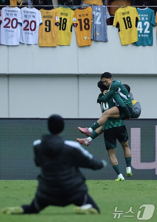 (서울=뉴스1) 박정호 기자 = 6일 오후 서울 마포구 월드컵로 서울월드컵경기장에서 열린 광주FC와 전북현대의 2025 하나은행 코리아컵 결승전에서 선제골을 넣은 전북 이동준이 송민규와 기쁨을 나누고 있다. 2025.12.6/뉴스1pjh2035@news1.krCopyright ⓒ 뉴스1. All rights reserved. 무단 전재 및 재배포, AI학습 이용 금지.