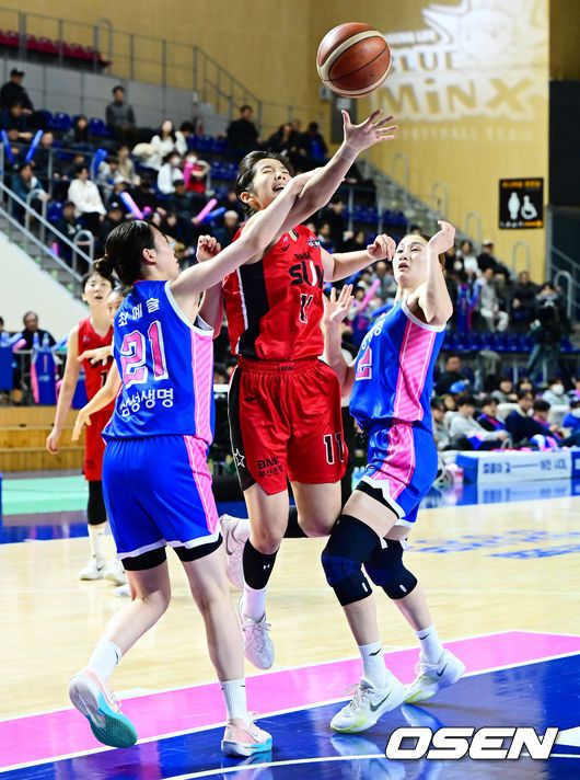 [OSEN=용인, 지형준 기자] 6일 오후 용인실내체육관에서 BNK금융 2025-26 여자프로농구 삼성생명과 BNK 썸의 경기가 열렸다. 중위권 경쟁을 펼치는 두 팀의 대결이다. 삼성생명은 4위(2승3패), BNK 썸은 3위(3승 2패)를 기록중이다. 1쿼터 BNK 썸 김정은이 삼성생명 수비를 피해 슛을 시도하고 있다. 2025.12.06 /jpnews@osen.co.kr