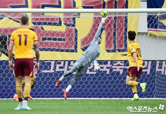 (엑스포츠뉴스 박지영 기자) 6일 오후 서울월드컵경기장에서 열린 '2025 하나은행 코리아컵 결승전' 광주FC와 전북 현대의 경기, 광주 골키퍼 김경민이 슛을 막아내고 있다.박지영 기자 jypark@xportsnews.com
