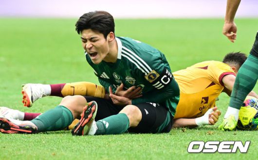 [OSEN=상암월드컵경기장, 조은정 기자] 2025 하나은행 코리아컵 전북FC와 광주FC의 결승전이 6일 서울 마포구 서울월드컵경기장에서 열렸다. 시민구단 광주는 사상 첫 코리안컵 우승에 도전, 전북은 올해 K리그1 우승에 이어 두 번째 더블을 노린다. 전반 전북 박진섭이 광주 헤이스 파울에 고통스러워하고 있다. 2025.12.06 /cej@osen.co.kr
