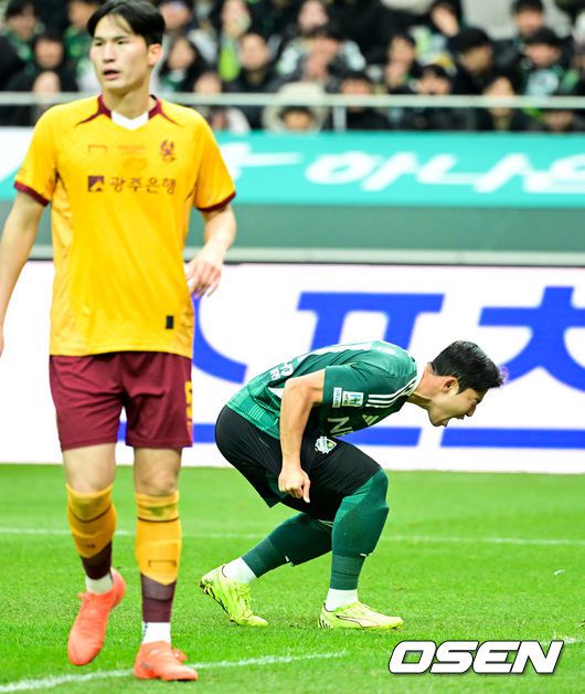 [OSEN=상암월드컵경기장, 조은정 기자] 2025 하나은행 코리아컵 전북FC와 광주FC의 결승전이 6일 서울 마포구 서울월드컵경기장에서 열렸다. 시민구단 광주는 사상 첫 코리안컵 우승에 도전, 전북은 올해 K리그1 우승에 이어 두 번째 더블을 노린다. 후반 전북 김태현이 슛이 들어가지 않자 아쉬워하고 있다. 2025.12.06 /cej@osen.co.kr