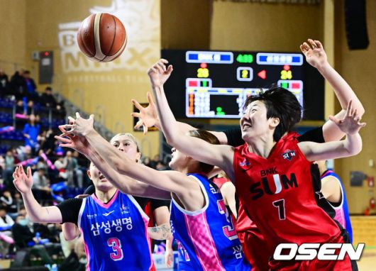 [OSEN=용인, 지형준 기자] 6일 오후 용인실내체육관에서 BNK금융 2025-26 여자프로농구 삼성생명과 BNK 썸의 경기가 열렸다. 중위권 경쟁을 펼치는 두 팀의 대결이다. 삼성생명은 4위(2승3패), BNK 썸은 3위(3승 2패)를 기록중이다. 2쿼터 BNK 썸 박혜진이 삼성생명 윤예빈 등과 리바운드를 다투고 있다. 2025.12.06 /jpnews@osen.co.kr