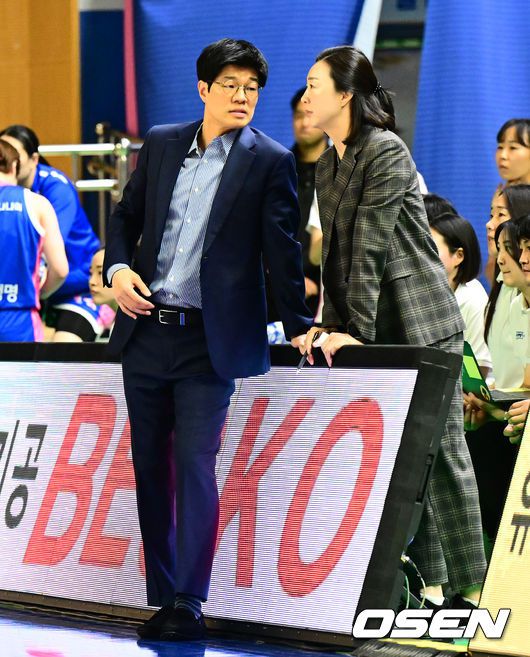 [OSEN=용인, 지형준 기자] 6일 오후 용인실내체육관에서 BNK금융 2025-26 여자프로농구 삼성생명과 BNK 썸의 경기가 열렸다. 중위권 경쟁을 펼치는 두 팀의 대결이다. 삼성생명은 4위(2승3패), BNK 썸은 3위(3승 2패)를 기록중이다. 2쿼터 삼성생명 하성윤 감독과 이미선 코치가 이야기를 나누고 있다. 2025.12.06 /jpnews@osen.co.kr