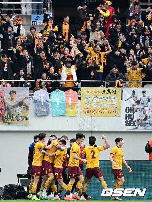[OSEN=상암월드컵경기장, 조은정 기자] 2025 하나은행 코리아컵 전북FC와 광주FC의 결승전이 6일 서울 마포구 서울월드컵경기장에서 열렸다. 시민구단 광주는 사상 첫 코리안컵 우승에 도전, 전북은 올해 K리그1 우승에 이어 두 번째 더블을 노린다. 후반 광주 프리드욘슨이 헤더로 동점골 만든 뒤 동료들과 기뻐하고 있다. 2025.12.06 /cej@osen.co.kr