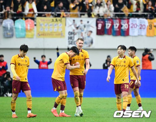 [OSEN=상암월드컵경기장, 조은정 기자] 2025 하나은행 코리아컵 전북FC와 광주FC의 결승전이 6일 서울 마포구 서울월드컵경기장에서 열렸다. 시민구단 광주는 사상 첫 코리안컵 우승에 도전, 전북은 올해 K리그1 우승에 이어 두 번째 더블을 노린다. 후반 광주 프리드욘슨이 헤더로 동점골 만든 뒤 세리머니를 하고 있다. 2025.12.06 /cej@osen.co.kr