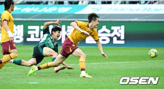 [OSEN=상암월드컵경기장, 조은정 기자] 2025 하나은행 코리아컵 전북FC와 광주FC의 결승전이 6일 서울 마포구 서울월드컵경기장에서 열렸다. 시민구단 광주는 사상 첫 코리안컵 우승에 도전, 전북은 올해 K리그1 우승에 이어 두 번째 더블을 노린다. 후반 전북 전진우가 광주 진시우와 충돌하며 넘어지고 있다. 2025.12.06 /cej@osen.co.kr