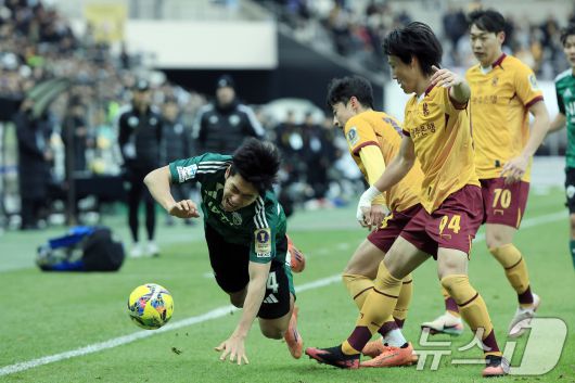 (서울=뉴스1) 박정호 기자 = 6일 오후 서울 마포구 월드컵로 서울월드컵경기장에서 열린 광주FC와 전북현대의 2025 하나은행 코리아컵 결승전에서 전북 전진우가 광주 심상민 등의 수비에 넘어지고 있다. 2025.12.6/뉴스1pjh2035@news1.krCopyright ⓒ 뉴스1. All rights reserved. 무단 전재 및 재배포, AI학습 이용 금지.