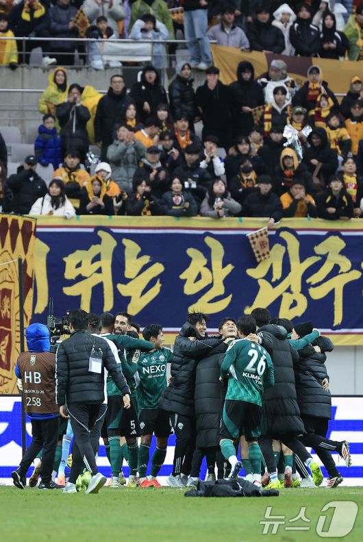 (서울=뉴스1) 박정호 기자 = 6일 오후 서울 마포구 월드컵로 서울월드컵경기장에서 열린 광주FC와 전북현대의 2025 하나은행 코리아컵 결승전에서 2대1로 승리해 우승을 차지한 전북 선수들이 기뻐하고 있다. 2025.12.6/뉴스1pjh2035@news1.krCopyright ⓒ 뉴스1. All rights reserved. 무단 전재 및 재배포, AI학습 이용 금지.