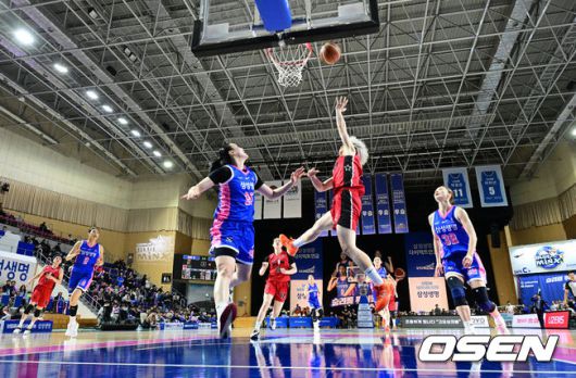[OSEN=용인, 지형준 기자] 6일 오후 용인실내체육관에서 BNK금융 2025-26 여자프로농구 삼성생명과 BNK 썸의 경기가 열렸다. 이날 삼성생명은 이해란이 31득점을 올리는 활약 속에 BNK 썸에 65-62 승리를 거뒀다. BNK 썸 안혜지가 레이업을 성공시키고 있다. 2025.12.06 /jpnews@osen.co.kr