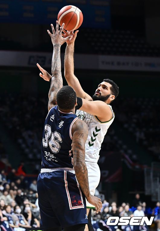 원주 DB 에삼 무스타파가 부산 KCC 숀롱의 마크를 피해 골밑슛을 시도하고 있다. 2025.12.06 / foto0307@osen.co.kr