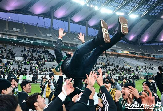 (엑스포츠뉴스 박지영 기자) 6일 오후 서울월드컵경기장에서 열린 '2025 하나은행 코리아컵 결승전' 광주FC와 전북 현대의 경기, 전북이 2:1의 스코어로 승리하며 5년 만에 더블(2관왕)을 달성했다. 경기 종료 후 전북 선수들이 포옛 감독을 헹가래치고 있다.박지영 기자 jypark@xportsnews.com