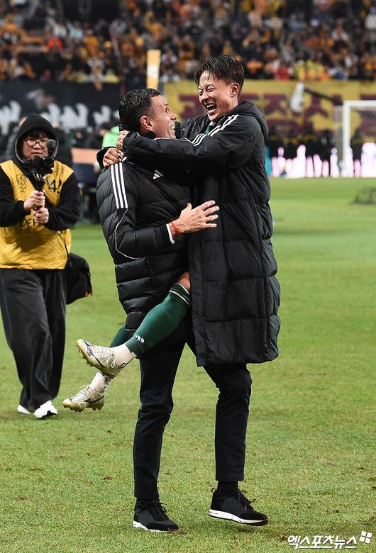 (엑스포츠뉴스 박지영 기자) 6일 오후 서울월드컵경기장에서 열린 '2025 하나은행 코리아컵 결승전' 광주FC와 전북 현대의 경기, 전북이 2:1의 스코어로 승리하며 5년 만에 더블(2관왕)을 달성했다. 경기 종료 후 전북 포옛 감독이 이승우를 안아들고 그라운드에서 발걸음을 옮기고 있다.박지영 기자 jypark@xportsnews.com