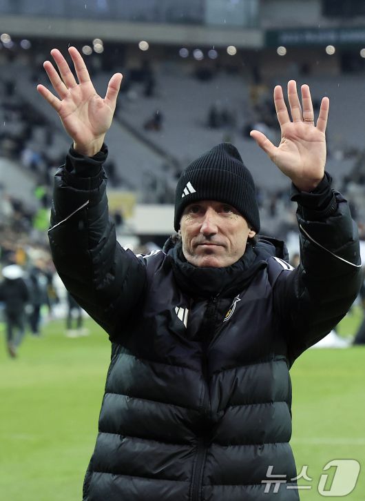 (서울=뉴스1) 박정호 기자 = 6일 오후 서울 마포구 월드컵로 서울월드컵경기장에서 열린 광주FC와 전북현대의 2025 하나은행 코리아컵 결승전에서 2대1로 승리해 우승을 차지한 전북현대의 타노스 수석코치가 서포터즈를 향해 손을 흔들고 있다. 2025.12.6/뉴스1