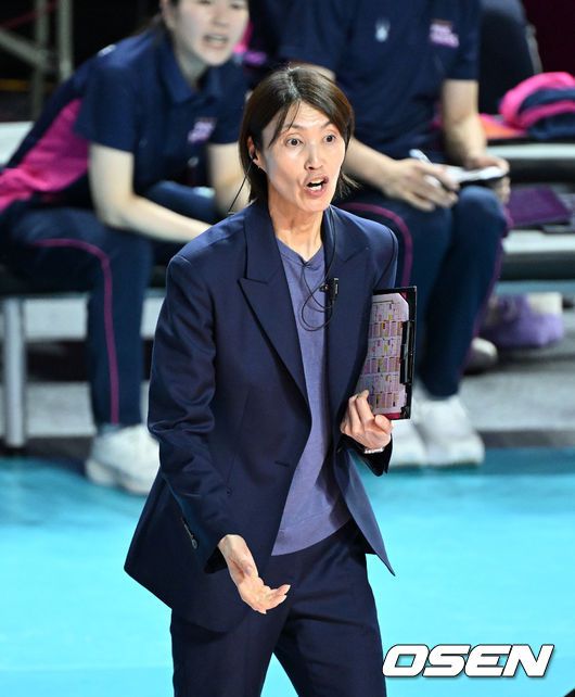 [OSEN=인천, 이대선 기자] 6일 인천 삼산월드체육관에서 프로배구 진에어 2025~26 V리그 흥국생명과 현대건설의 경기가 열렸다. 현대건설은 승점 20점으로 2위, 흥국생명은 승점 18점으로 3위를 기록하고 있다. 2세트 흥국생명 요시하라 토모코 감독이 작전을 지시하고 있다. 2025.12.06 /sunday@osen.co.kr