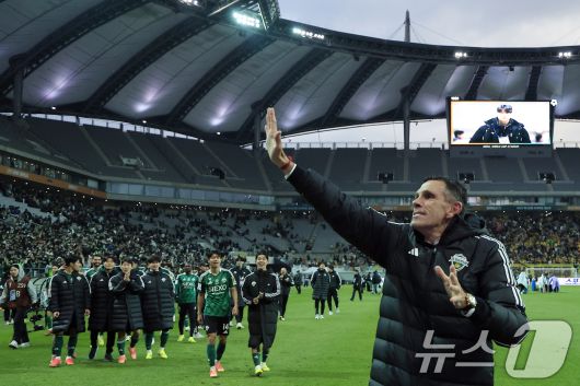 (서울=뉴스1) 박정호 기자 = 6일 오후 서울 마포구 월드컵로 서울월드컵경기장에서 열린 광주FC와 전북현대의 2025 하나은행 코리아컵 결승전에서 2대1로 승리해 우승을 차지한 전북현대 거스 포옛 감독이 서포터즈와 기쁨을 나누고 있다. 2025.12.6/뉴스1