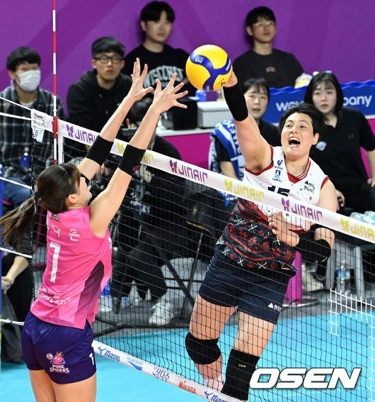 [OSEN=인천, 이대선 기자] 6일 인천 삼산월드체육관에서 프로배구 진에어 2025~26 V리그 흥국생명과 현대건설의 경기가 열렸다. 현대건설은 승점 20점으로 2위, 흥국생명은 승점 18점으로 3위를 기록하고 있다. 2세트 현대건설 김희진이 공격을 시도하고 있다. 2025.12.06 /sunday@osen.co.kr