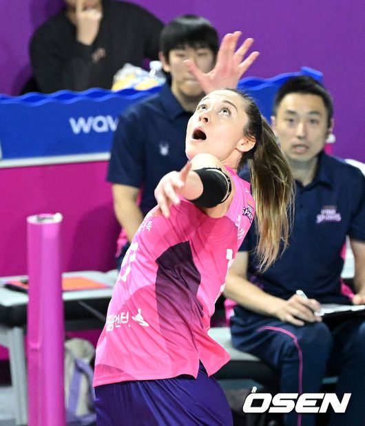 [OSEN=인천, 이대선 기자] 6일 인천 삼산월드체육관에서 프로배구 진에어 2025~26 V리그 흥국생명과 현대건설의 경기가 열렸다. 현대건설은 승점 20점으로 2위, 흥국생명은 승점 18점으로 3위를 기록하고 있다. 1세트 흥국생명 레베카가 공격을 시도하고 있다. 2025.12.06 /sunday@osen.co.kr