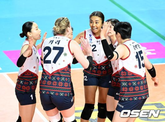 [OSEN=인천, 이대선 기자] 6일 인천 삼산월드체육관에서 프로배구 진에어 2025~26 V리그 흥국생명과 현대건설의 경기가 열렸다. 현대건설은 승점 20점으로 2위, 흥국생명은 승점 18점으로 3위를 기록하고 있다. 1세트 현대건설 선수들이 득점에 환호하고 있다. 2025.12.06 /sunday@osen.co.kr