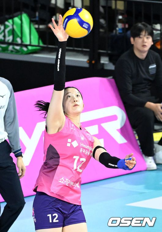 [OSEN=인천, 이대선 기자] 6일 인천 삼산월드체육관에서 프로배구 진에어 2025~26 V리그 흥국생명과 현대건설의 경기가 열렸다. 현대건설은 승점 20점으로 2위, 흥국생명은 승점 18점으로 3위를 기록하고 있다. 1세트 흥국생명 이다현이 서브를 시도하고 있다. 2025.12.06 /sunday@osen.co.kr