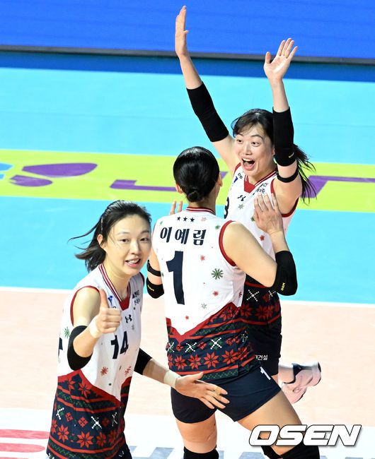 [OSEN=인천, 이대선 기자] 6일 인천 삼산월드체육관에서 프로배구 진에어 2025~26 V리그 흥국생명과 현대건설의 경기가 열렸다. 현대건설은 승점 20점으로 2위, 흥국생명은 승점 18점으로 3위를 기록하고 있다. 1세트 득점에 성공한 현대건설 선수들이 환호하고 있다. 2025.12.06 /sunday@osen.co.kr