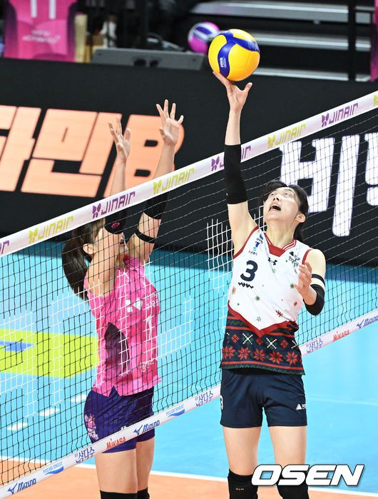 [OSEN=인천, 이대선 기자] 6일 인천 삼산월드체육관에서 프로배구 진에어 2025~26 V리그 흥국생명과 현대건설의 경기가 열렸다. 현대건설은 승점 20점으로 2위, 흥국생명은 승점 18점으로 3위를 기록하고 있다. 1세트 현대건설 김다인이 공격을 시도하고 있다. 2025.12.06 /sunday@osen.co.kr
