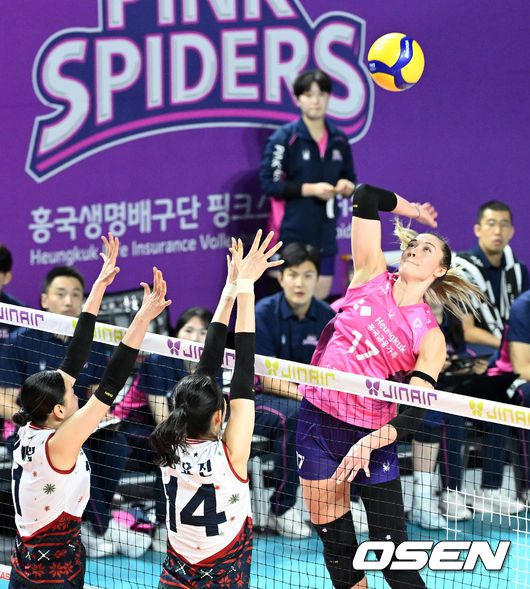 [OSEN=인천, 이대선 기자] 6일 인천 삼산월드체육관에서 프로배구 진에어 2025~26 V리그 흥국생명과 현대건설의 경기가 열렸다. 현대건설은 승점 20점으로 2위, 흥국생명은 승점 18점으로 3위를 기록하고 있다. 1세트 흥국생명 레베카가 공격을 시도하고 있다. 2025.12.06 /sunday@osen.co.kr