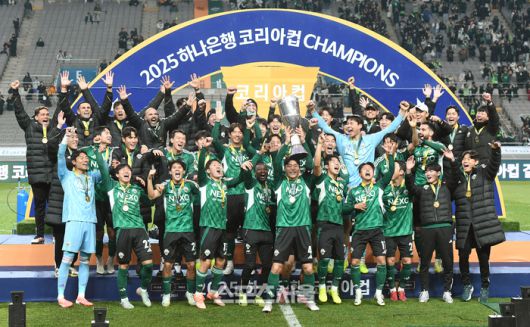 전북 현대 주장 박진섭과 선수들이 6일 서울월드컵경기장에서 열린 2025 하나은행 코리아컵 광주FC와의 결승전에서 2-1로 승리하며 우승을 차지한 뒤 트로피를 들어올리며 기뻐하고 있다. 전북은 K리그1에 이어 코리아컵까지 우승하며 더블을 달성했다. 2025. 12. 6.
