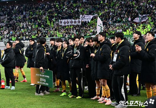 (엑스포츠뉴스 박지영 기자) 6일 오후 서울월드컵경기장에서 열린 '2025 하나은행 코리아컵 결승전' 광주FC와 전북 현대의 경기, 전북이 2:1의 스코어로 승리하며 5년 만에 더블(2관왕)을 달성했다. 경기 종료 후 광주 선수단이 준우승 수상 후 전북의 우승 수상을 지켜보며 박수를 보내고 있다.박지영 기자 jypark@xportsnews.com