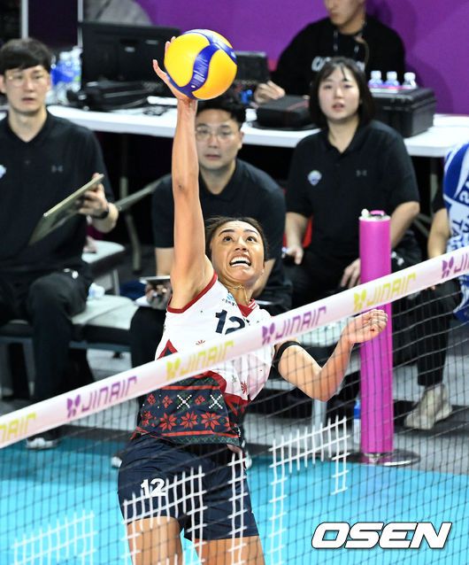 [OSEN=인천, 이대선 기자] 6일 인천 삼산월드체육관에서 프로배구 진에어 2025~26 V리그 흥국생명과 현대건설의 경기가 열렸다. 현대건설은 승점 20점으로 2위, 흥국생명은 승점 18점으로 3위를 기록하고 있다. 1세트 현대건설 자스티스가 공격을 시도하고 있다. 2025.12.06 /sunday@osen.co.kr