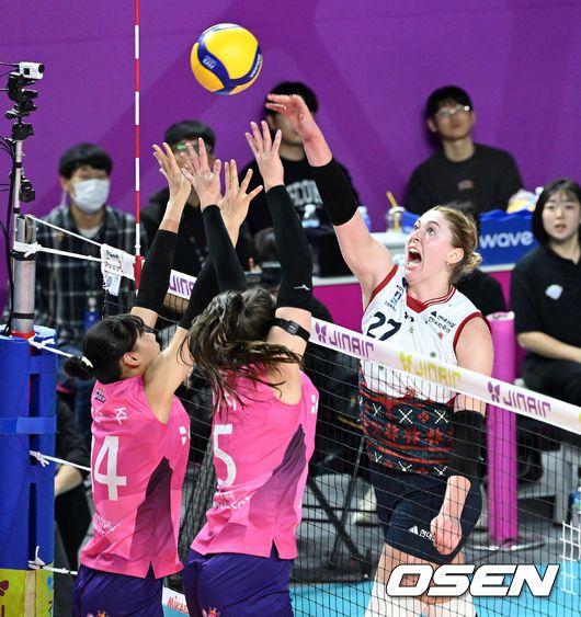 [OSEN=인천, 이대선 기자] 6일 인천 삼산월드체육관에서 프로배구 진에어 2025~26 V리그 흥국생명과 현대건설의 경기가 열렸다. 현대건설은 승점 20점으로 2위, 흥국생명은 승점 18점으로 3위를 기록하고 있다. 2세트 현대건설 카리가 공격을 시도하고 있다. 2025.12.06 /sunday@osen.co.kr