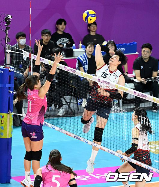 [OSEN=인천, 이대선 기자] 6일 인천 삼산월드체육관에서 프로배구 진에어 2025~26 V리그 흥국생명과 현대건설의 경기가 열렸다. 현대건설은 승점 20점으로 2위, 흥국생명은 승점 18점으로 3위를 기록하고 있다. 2세트 현대건설 김희진이 공격을 시도하고 있다. 2025.12.06 /sunday@osen.co.kr