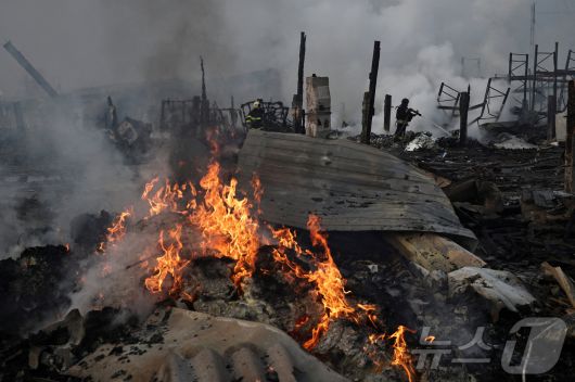 우크라이나 외곽의 한 창고 건물이 6일 새벽 러시아의 공격을 받아 불타고 있다. 2025.12.6 ⓒ 로이터=뉴스1 ⓒ News1 강민경 기자 |