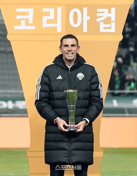 전북 현대 거스 포옛 감독이 6일 서울월드컵경기장에서 열린 2025 하나은행 코리아컵 광주FC와의 결승전에서 2-1로 승리하며 우승을 차지한 뒤 감독상을 수상하고 기념촬영을 하고 있다. 전북은 K리그1에 이어 코리아컵까지 우승하며 더블을 달성했다. 2025. 12. 6.