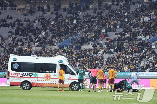(서울=뉴스1) 박정호 기자 = 6일 오후 서울 마포구 월드컵로 서울월드컵경기장에서 열린 광주FC와 전북현대의 2025 하나은행 코리아컵 결승전에서 전북 이승우의 태클에 크게 다친 광주 권성윤을 후송하기 위해 구급차가 도착하고 있다. 2025.12.6/뉴스1