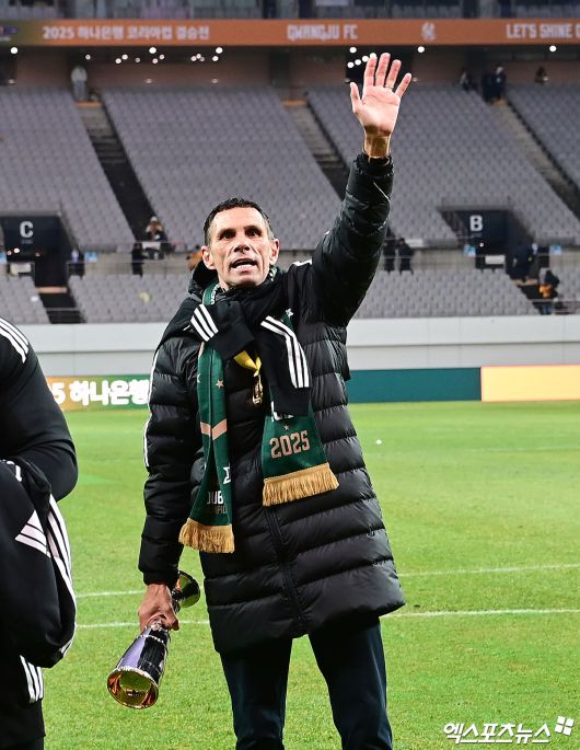 (엑스포츠뉴스 박지영 기자) 6일 오후 서울월드컵경기장에서 열린 '2025 하나은행 코리아컵 결승전' 광주FC와 전북 현대의 경기, 전북이 2:1의 스코어로 승리하며 5년 만에 더블(2관왕)을 달성했다. 경기 종료 후 전북 포옛 감독이 서포터즈석을 향해 인사하고 있다.박지영 기자 jypark@xportsnews.com