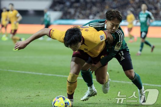 (서울=뉴스1) 박정호 기자 = 6일 오후 서울 마포구 월드컵로 서울월드컵경기장에서 열린 광주FC와 전북현대의 2025 하나은행 코리아컵 결승전에서 전북 이승우가 광주 조성권을 강하게 압박하고 있다. 2025.12.6/뉴스1pjh2035@news1.krCopyright ⓒ 뉴스1. All rights reserved. 무단 전재 및 재배포, AI학습 이용 금지.