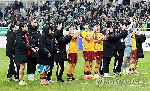 (서울=연합뉴스) 한종찬 기자 = 6일 오후 서울 마포구 월드컵로 서울월드컵경기장에서 열린 광주FC와 전북현대의 2025 하나은행 코리아컵 결승전. 아쉽게 패한 광주 FC 선수들이 팬들에게 인사하고 있다. 2025.12.6