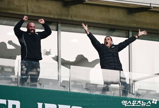 (엑스포츠뉴스 박지영 기자) 6일 오후 서울월드컵경기장에서 열린 '2025 하나은행 코리아컵 결승전' 광주FC와 전북 현대의 경기, 전북이 2:1의 스코어로 승리하며 5년 만에 더블(2관왕)을 달성했다. 경기 종료 후 전북 포옛 감독이 스카이박스 테라스로 나와 포효하고 있다.박지영 기자 jypark@xportsnews.com